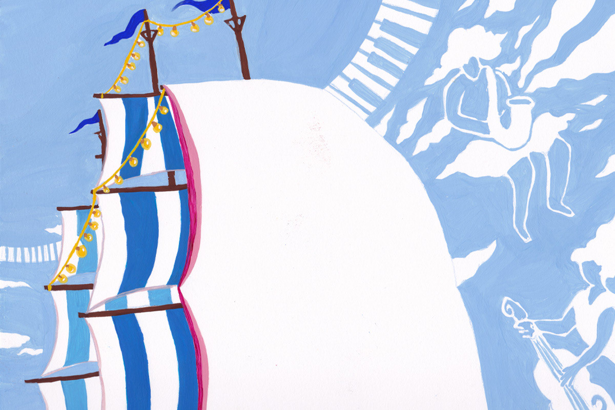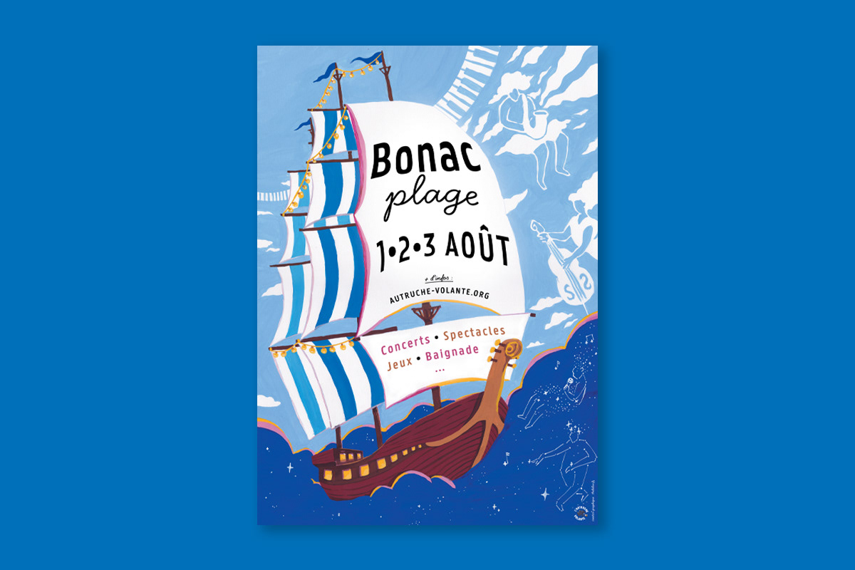 Réalisation de l'affiche pour le festival Bonac Plage 2025 : un festival familial transportant ses participants dans une aventure où musique, spectacle et bonne humeur naviguent ensemble. Illustration créée à la gouache.