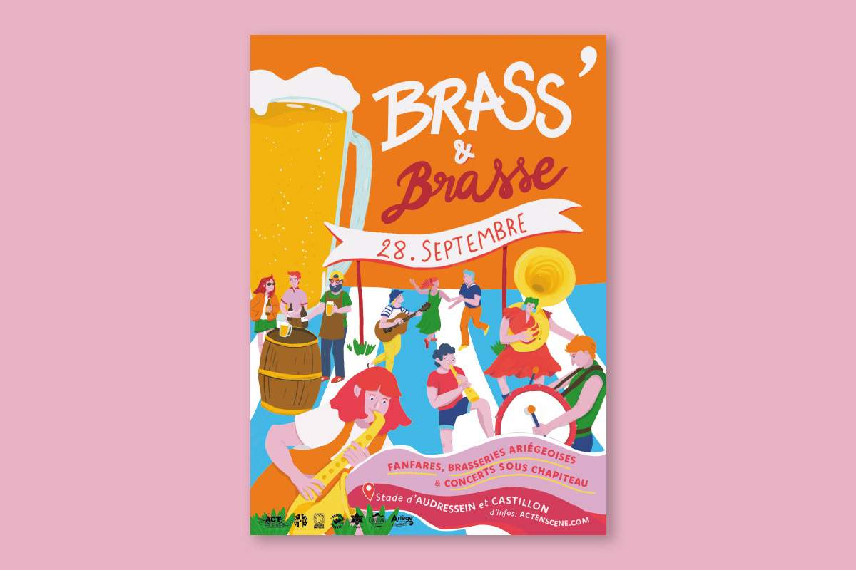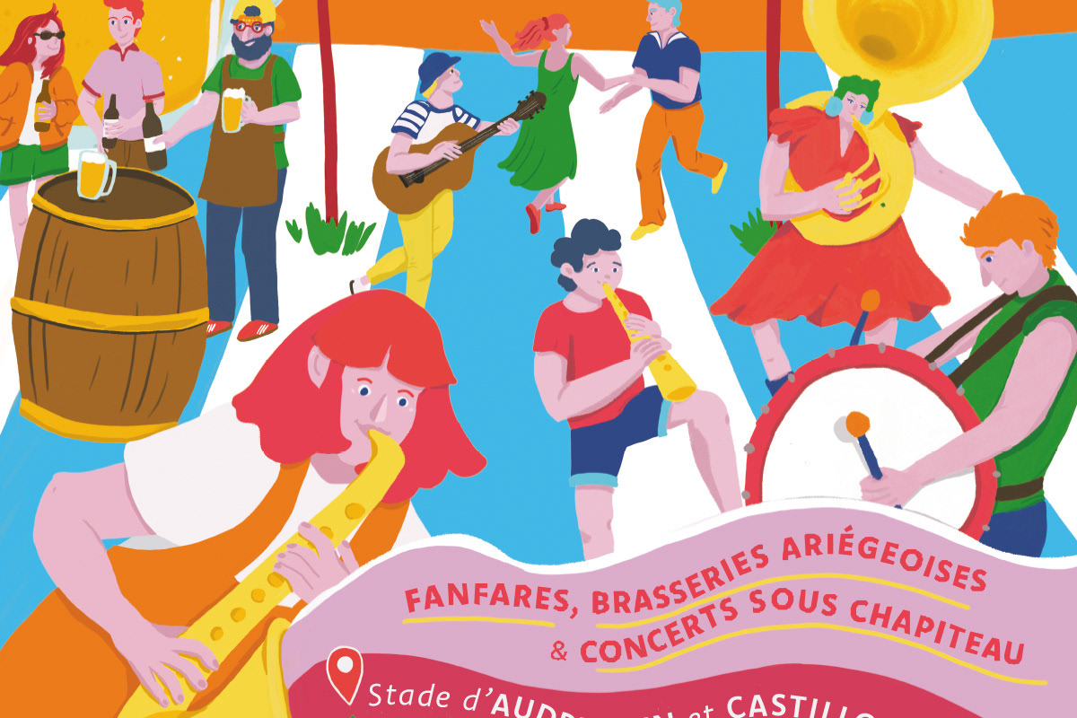 Création de l'affiche illustrée de l'événement pour l'édition 2024. Une rencontre entre fanfares et brasseries ariégeoises pour passer un moment des plus convivial.