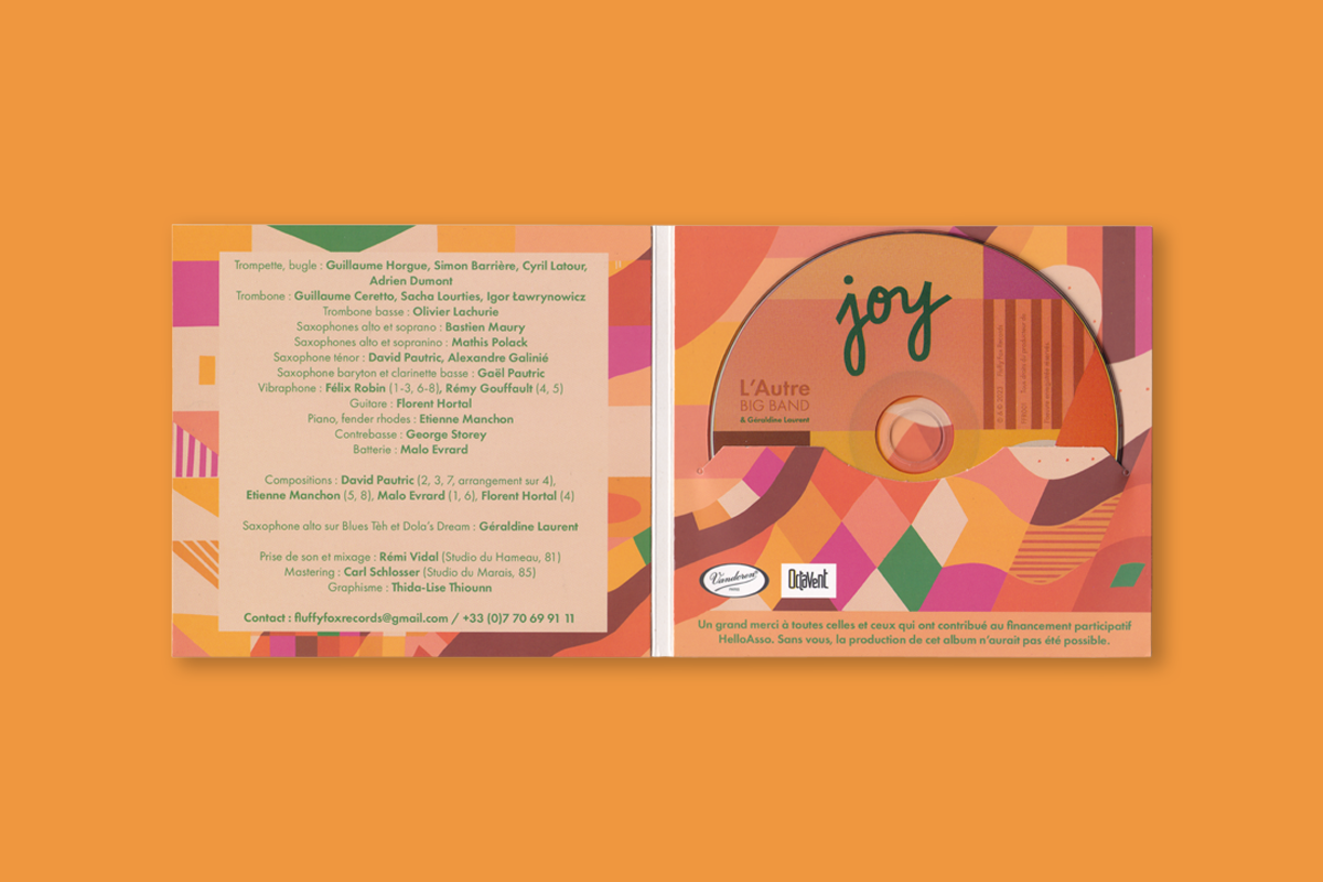 Création de l'aspect visuel et de la mise en page de l'album "Joy" de L'Autre Big Band. Création d'une affiche d'après le langage graphique établit.